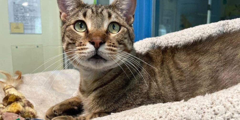 Meow! My name is Wart. I am a very sweet, confident, and talkative DSH brown/gold tabby male. My estimated DOB is 3/14/22. I look like I may have some Bengal or Savanna traits in me. I am very active and playful and demand my share of attention. I LOVE all kinds of petting and I like to rub against you seeking affection. I really like laps but let me be the one to climb onto you, as I’m NOT in love with being held yet and even less being scruffed. I’m not a cuddler though, as I’m always intrigued by other activity around me, so laps are just a way to be close to you. I was in rough shape when I arrived from Roswell, NM but I am feeling better and getting the appropriate meds. My fur is a little thin in my back area. I may have a food allergy, so I am testing with special food to see if my itching goes away. I also tested FIV+ during my medical review. I’ve had an outing while wearing a harness for some activity and I did great! I will probably need an active adopter to match my needs for attention, energy, playfulness, and perhaps willing to take me on walks or have a safe enclosure to enjoy a little outdoor time. Lots of wand play and toys will also be appropriate. I can be a little dominant with the shy kitties, and I may be happiest as your only feline. If you are the perfect person for me, please complete an adoption application wbcats.org/adopt